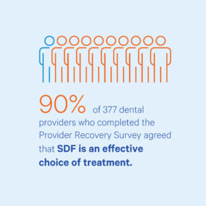 The evidence is strong, at 60%. (See more in CareQuest Institute’s newest infographic on SDF). I always find it interesting when providers ask me about use on adults. From my perspective, we know it is more effective then fluoride varnish, so why not use it? In my experience, it comes down to the esthetic aspect of SDF, so I approach it with patients regardless of age. I start by asking what is important to the patient for their oral health and present options that align.