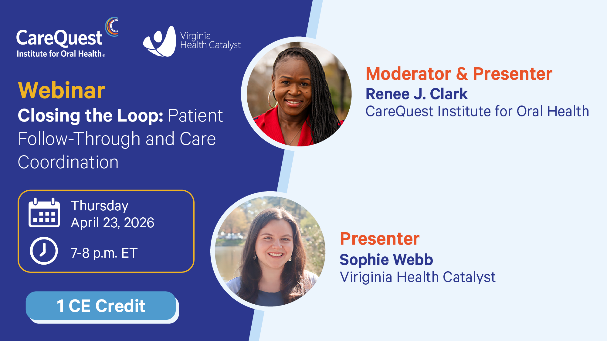 Join CareQuest Institute and Virginia Health Catalyst for a webinar that will explore how dental teams can move beyond isolated, one‑way referrals and establish closed‑loop referral pathways that support true care coordination and integration. Expert speakers will share practical strategies for designing and managing referral workflows, tracking patient follow‑through despite isolated EHRs and EDRs, reducing patient confusion, and communicating effectively with external providers.