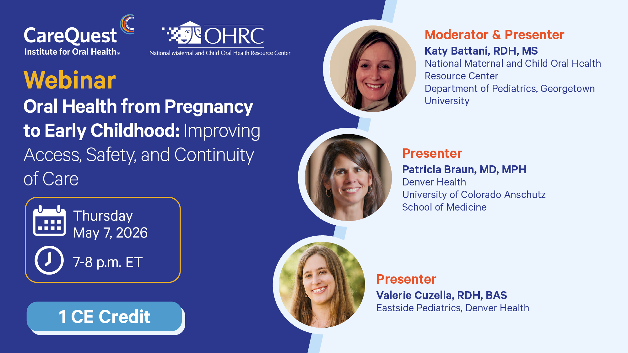 Join CareQuest Institute and the National Maternal and Child Oral Health Resource Center for a webinar that will explore the connection between maternal and child health, from pregnancy through early childhood. Drawing on clinical experience, national guidance, and real‑world workflows, our expert speakers will discuss how oral health teams can collaborate effectively with prenatal and pediatric care providers to improve access, safety, and continuity of care. They’ll also discuss common barriers to care — including workflow challenges and Medicaid-related coverage variations — and highlight practical strategies learners can implement in their own settings.