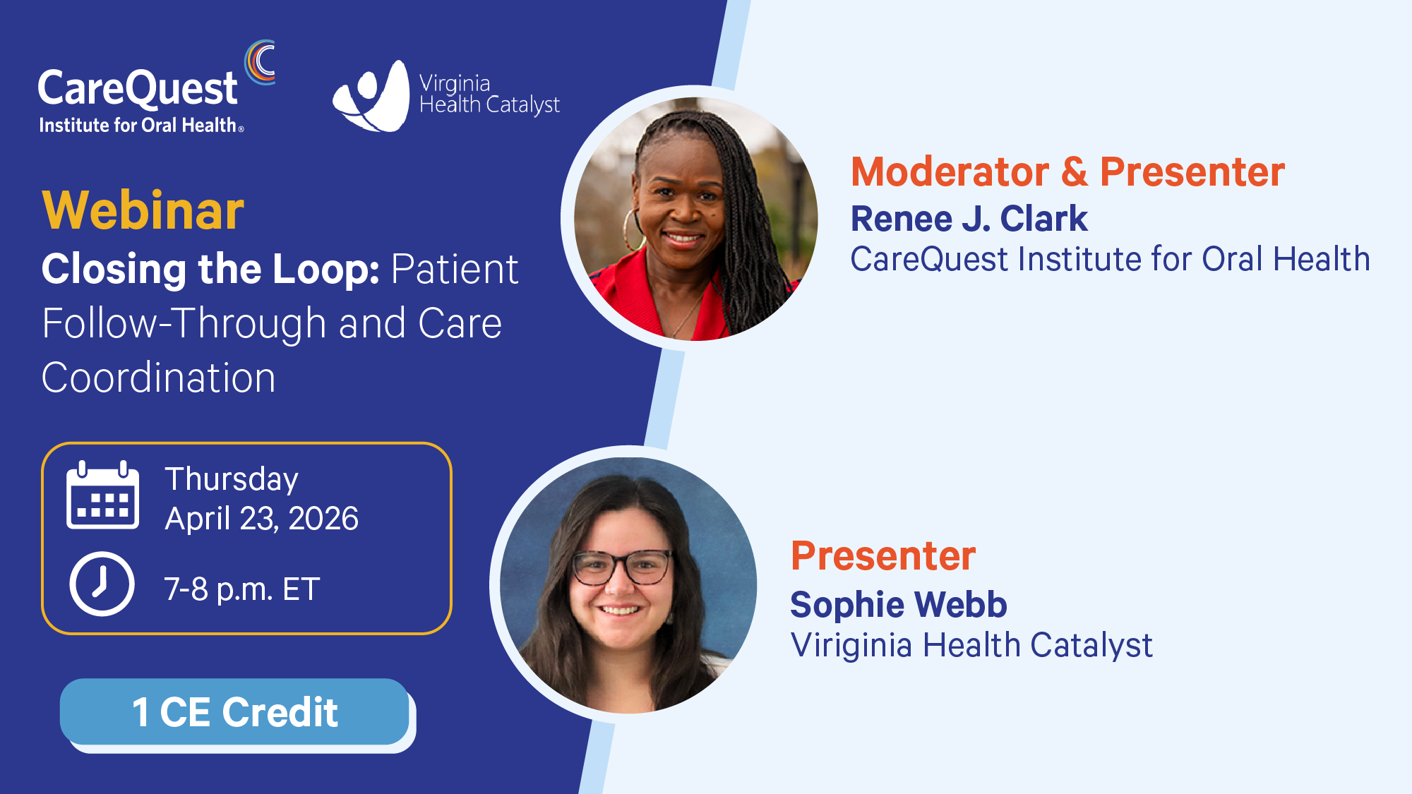 Join CareQuest Institute for a webinar that will explore how dental teams can move beyond isolated, one‑way referrals and establish closed‑loop referral pathways that support true care coordination and integration. Expert speakers will share practical strategies for designing and managing referral workflows, tracking patient follow‑through despite isolated EHRs and EDRs, reducing patient confusion, and communicating effectively with external providers.