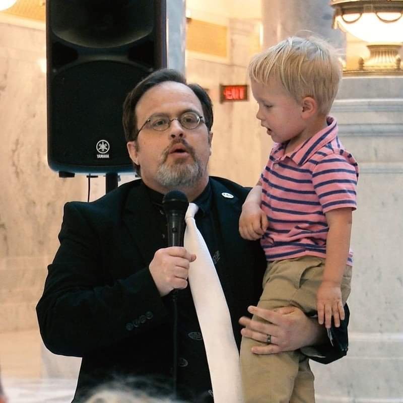 Paul Gibbs speaks to audience while holding son
