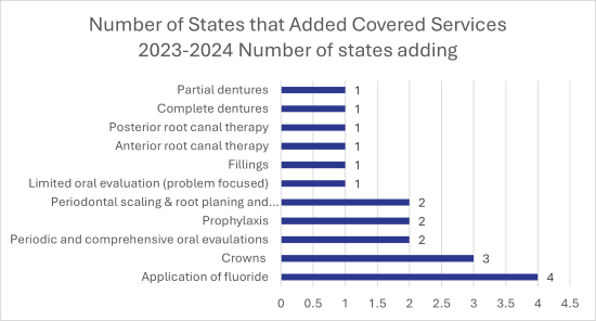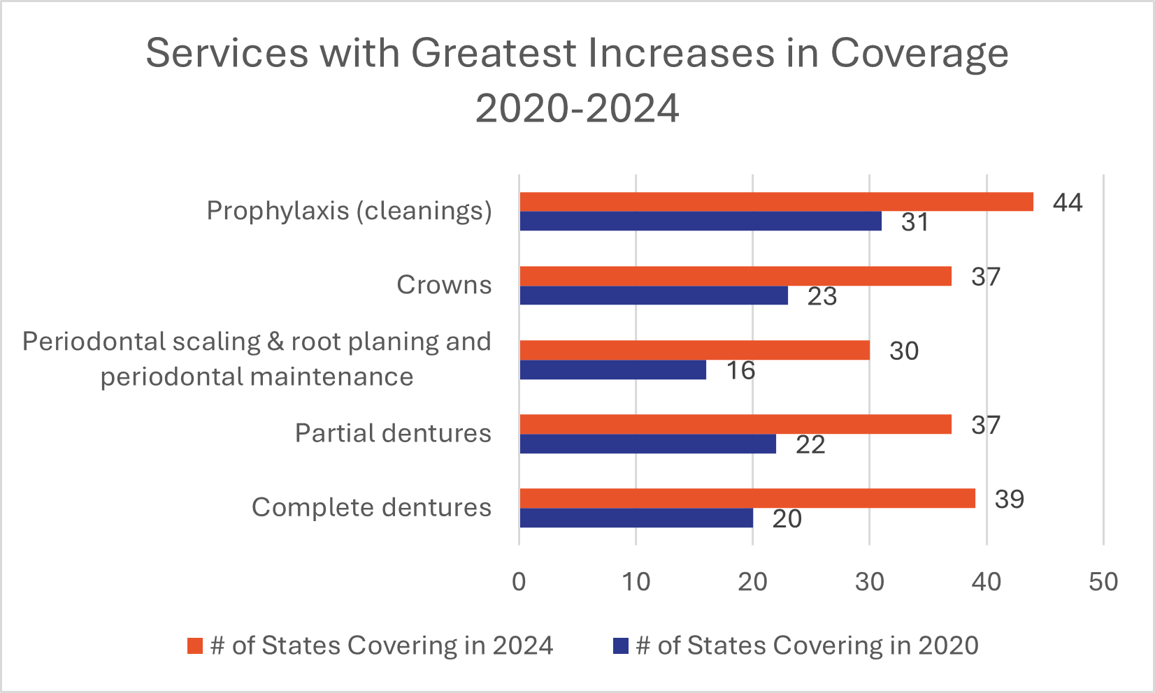In 2024, nine states broadened their benefit offerings by one or more services (e.g., cleanings, periodontal services, partial dentures) and/or increased the frequency of existing services (e.g., increasing coverage of cleanings from once to twice per year).