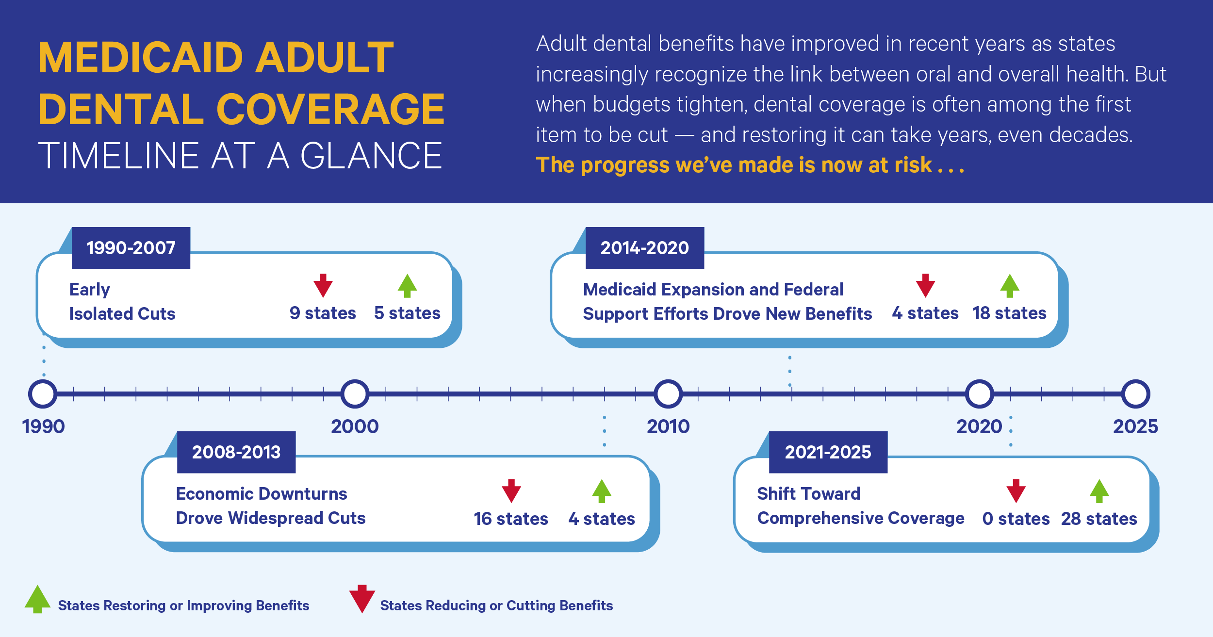 The graphic below illustrates how states have strengthened — and cut — adult dental benefits in the past 35 years. Gains from the past decade, in particular, are now at risk.