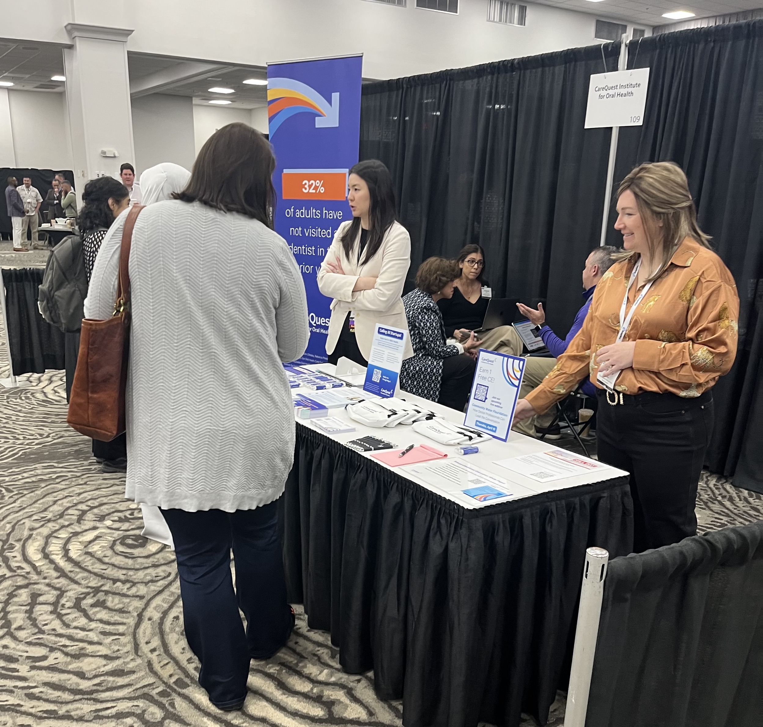 Rebecca Preston and Hannah Cheung, MPH, MS, RDH, talking to people at CareQuest Institute booth