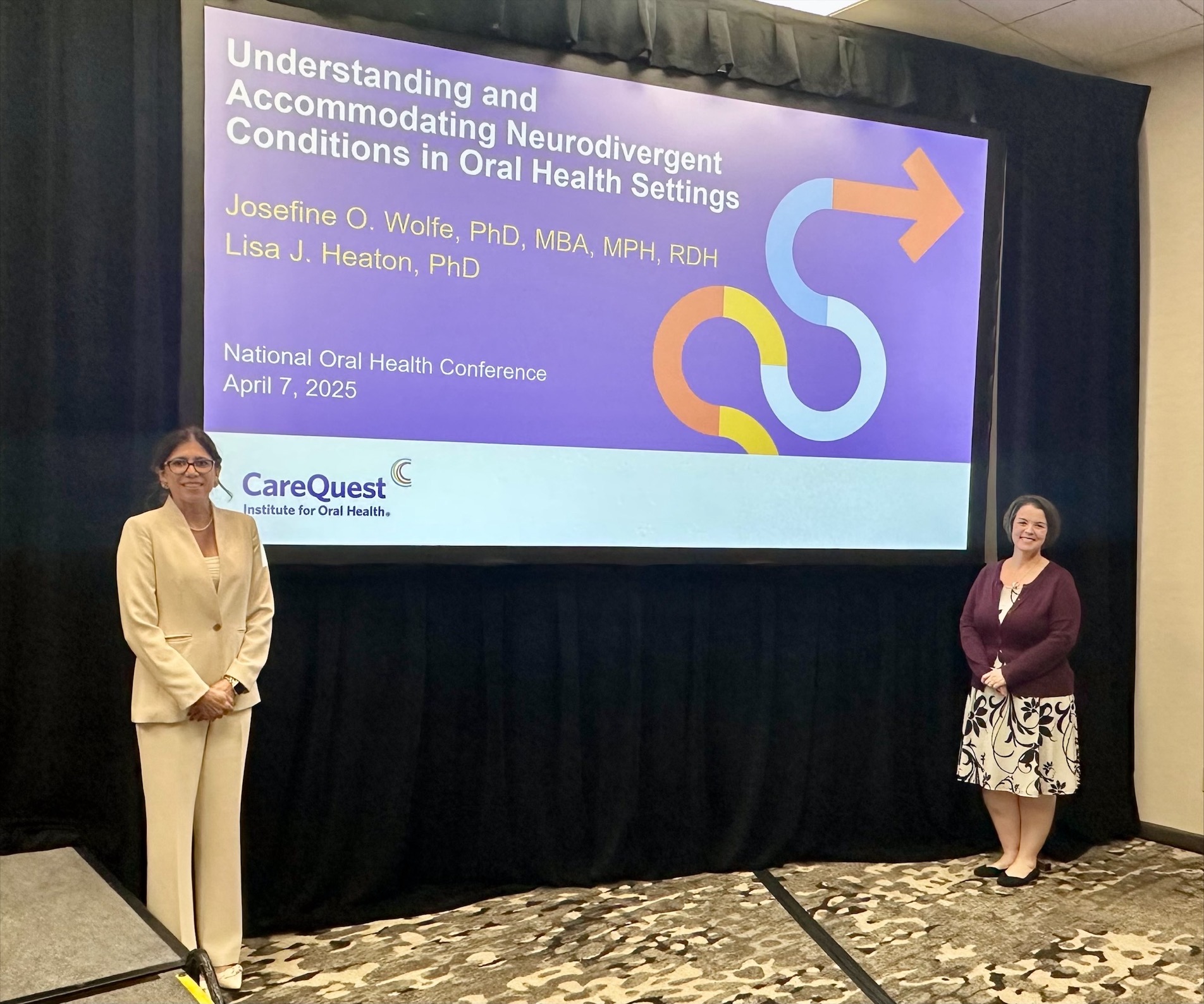The work of “finding innovations in oral health,” the theme of the conference, was on display on Monday and Tuesday, with nearly 40 educational presentations and a collection of roundtable discussions — several of which featured thought leaders from CareQuest Institute. They ran the gamut from incorporating oral health education into soccer programming and teledentistry in schools, to community water fluoridation updates and accommodating neurodivergent conditions in oral health. In the latter presentation, CareQuest Institute’s Lisa Heaton, PhD, and Josefine Ortiz Wolfe, PhD, MBA, MPH, RDH, shared a mix of research and personal stories that captivated a roomful of more than 80 learners on Monday morning.