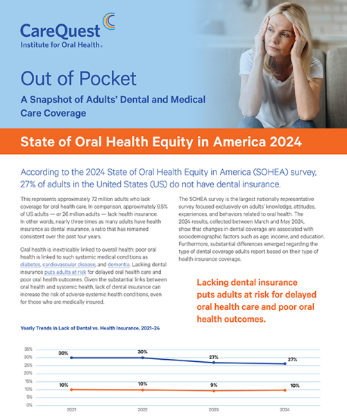 The State of Oral Health Equity in America 2024 survey was designed by CareQuest Institute for Oral Health. Information was collected by NORC at the University of Chicago from March through May 2024, from adults 18 and older on the AmeriSpeak panel. AmeriSpeak is a probability-based panel designed to be representative of the US household population. Randomly selected US households were sampled using area probability and address-based sampling, with a known, non-zero probability of selection from the NORC National Sample Frame. Sampled households were contacted by US mail, telephone, and field interviewers. An additional general population sample was selected at the state level to increase the number of complete interviews for individual state oversamples. In 2024, a sampling unit of 22,448 was used, with a final sample size of 9,307 and a final weighted cumulative response rate of 41.5%. All data presented account for appropriate sample weights. The margin of error for the survey is 1.44%. All results presented are statistically significant at the p < 0.05 level unless otherwise noted.